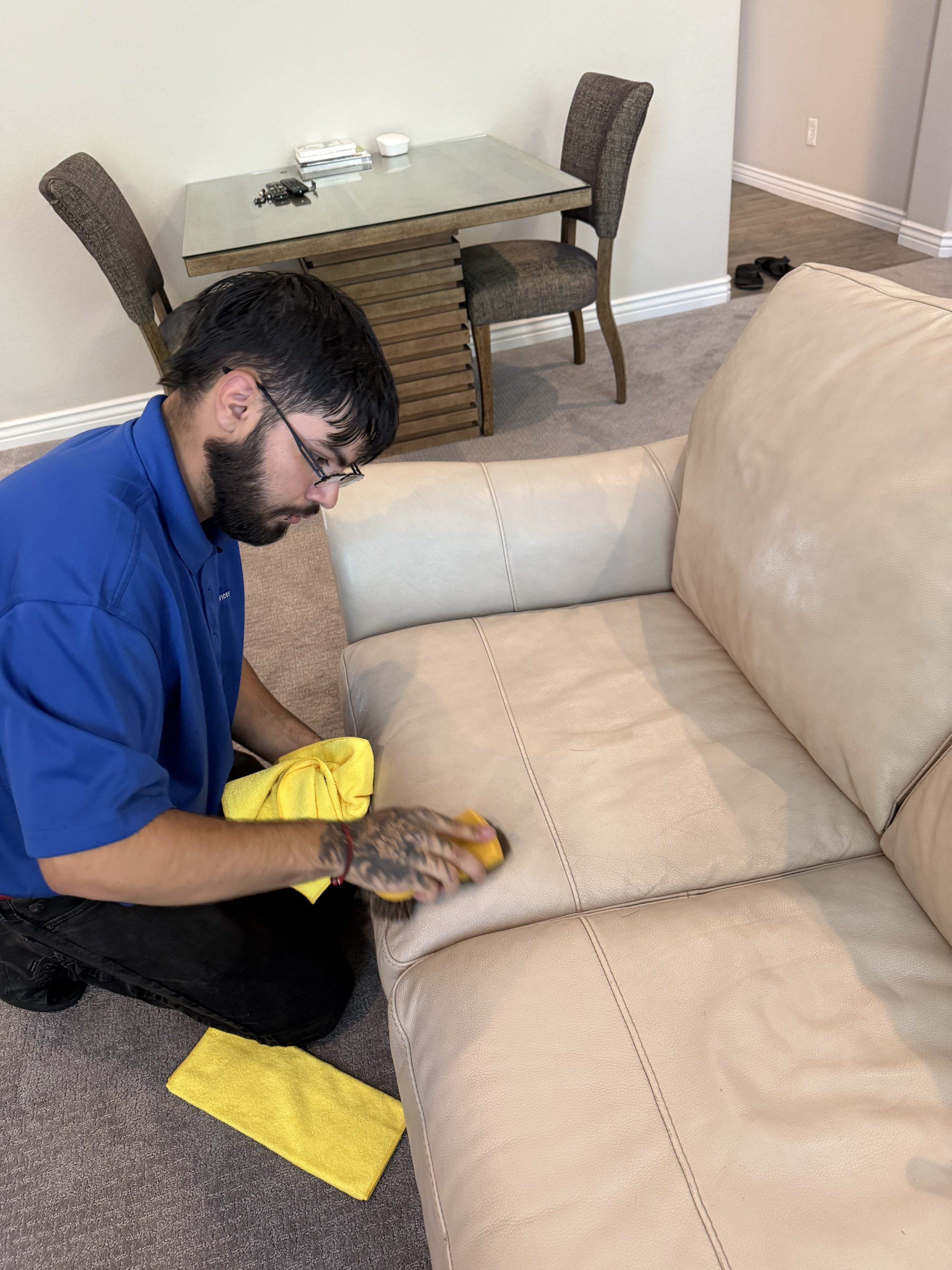 Leather furniture deserves a different level of care than fabric or carpet. Oils from skin, everyday dust, and normal use slowly dull the finish, stiffen the leather, and darken high-touch areas.